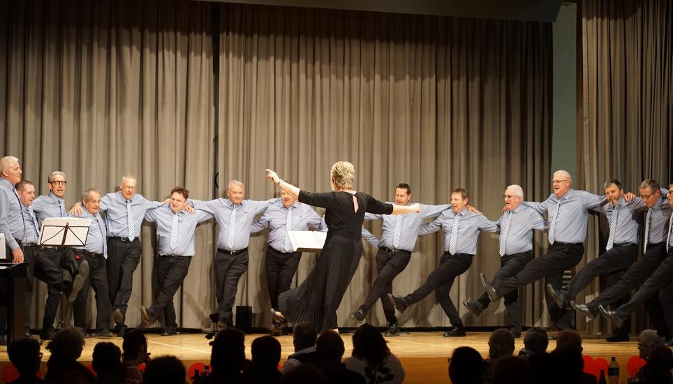 Leicht verschwitzt und ausser Puste stehen die 17 Männer auf der Bühne. Unter ihnen ist auch Chorpräsident Markus Hohl. Gleich davor steht Dirigentin Kornelia Scherer. Doch warum sind die Männer so ausser Puste? Ganz einfach: Wer sich einer derartigen Tanzeinlage unterzieht und nebenher singt – und dies auch noch gut – dem muss ja irgendwann die Luft ein wenig wegbleiben. «Wir sind dann mal am Beatmungsgerät, während ihr den nächsten Gang geniessen könnt», sagt Hohl und lacht. Man ist sich den Ablauf von einem normalen Chor-Chränzli gewöhnt. Es werden viele verschiedene Lieder performt und nebenher wird etwas gegessen. Ganz klar dürfen da auch diverse Sketches, Lösli und eine Tombola nicht fehlen. Beim Männerchor Schlatt stimmt vieles überein, aber so ganz normal ist es eben doch nicht. «Wir können nicht einfach 16 Lieder durchsingen», so Hohl am Anfang der Unterhaltung – das Publikum lacht. Also haben sich die Sänger mit Dirigentin Kornelia Scherer überlegt, ganz einfach Lieder-Blocks zu singen. Dazwischen werden die Gäste mit verschiedenen Gängen verwöhnt.